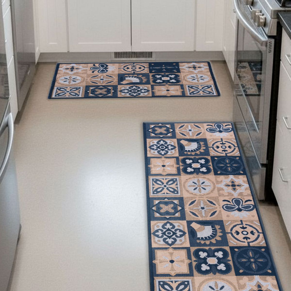 O kit é composto por 3 peças, sendo 1 passadeira de 0,50 x 1,20 m e 2 tapetes de 0,50 x 0,80 m, perfeitos para posicionar em frente à pia, fogão e bancada. Uma excelente opção de tapete para cozinha antiderrapante, funcional e decorativo, para quem deseja comprar tapete online com qualidade.